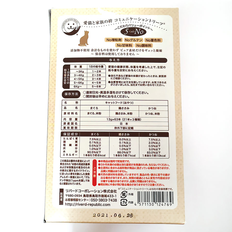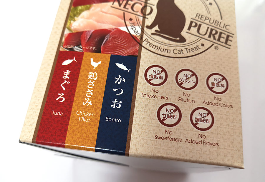 国産の「まぐろ・鶏ささみ・かつお」と3種類のスティックが入っている商品がおすすめです。同じメーカーから似たパッケージで、無添加で無い商品も出ています。無添加にこだわりたい方は、ぜひこちらを選んでください。NO増粘剤、NOグルテン、NO着色料、NO甘味料、NO調味料というめずらしい商品です。