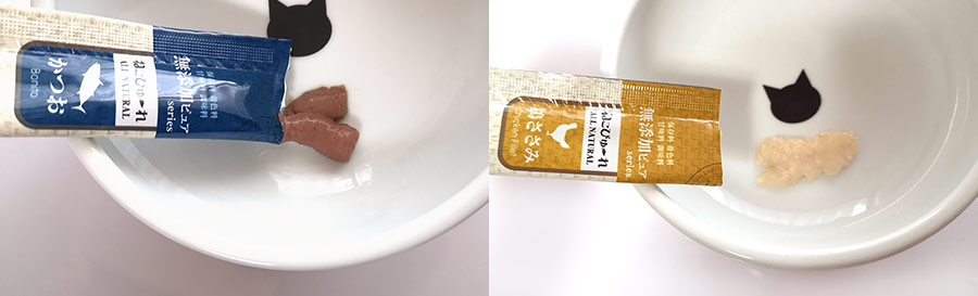 左がカツオ、右がササミです。猫3匹にあげてみましたが、どれも食いつきが良かったです。