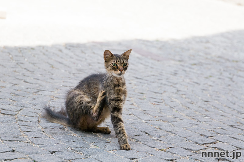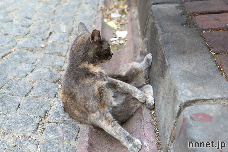 グレーさんはというと、道路の溝の部分に体をしずめてリラックス中。あ。そういえば、2匹目の茶トラさんも、溝に入っていましたよね。そして、このグレーさんは避妊手術の印の耳カットがされていました。