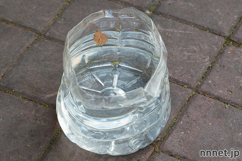 ここには、新鮮な猫用のお水が置かれていました。ヨーロッパでみかける猫の水入れは、このように大きなペットボトルの底を利用したものが多いです。切り口の部分は、猫がケガをしないように外側に折られていますね。たっぷり入るので、重みがあり、風に飛ばされることもなさそうです。