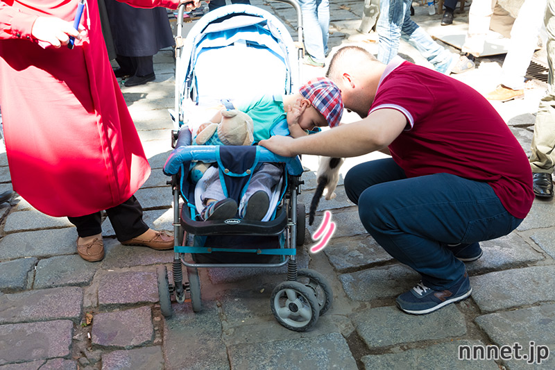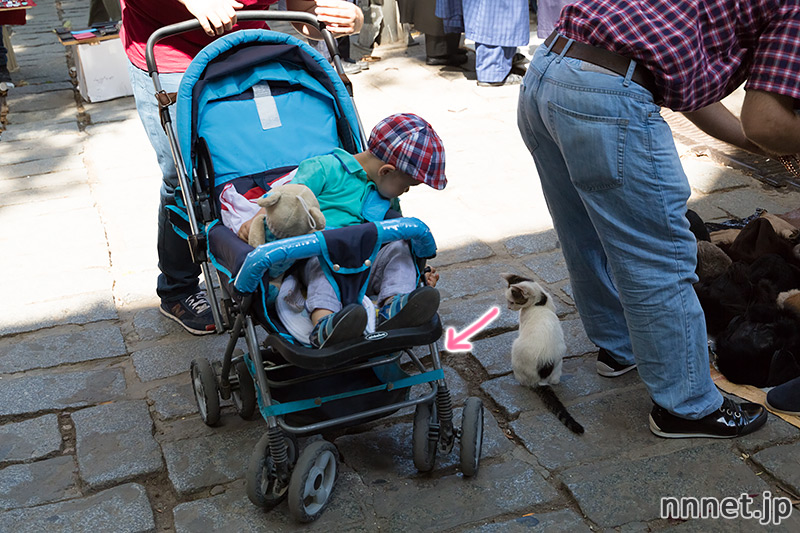 お天気が良いので、たくさんの人達でごった返しています。そんな人混みの中に、猫さんがぽつんと座っていました。
