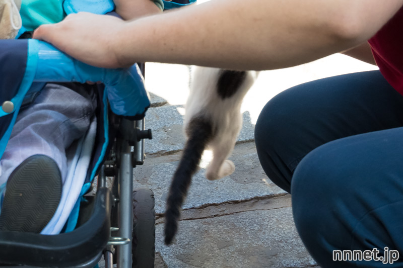 ベビーカーに乗った男の子が、猫にさわろうと手を差し出します。