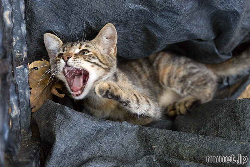 大あくびー♪ ちょっと茶色も混じっている、かわいいキジトラさんです。あ!歯が小さい。