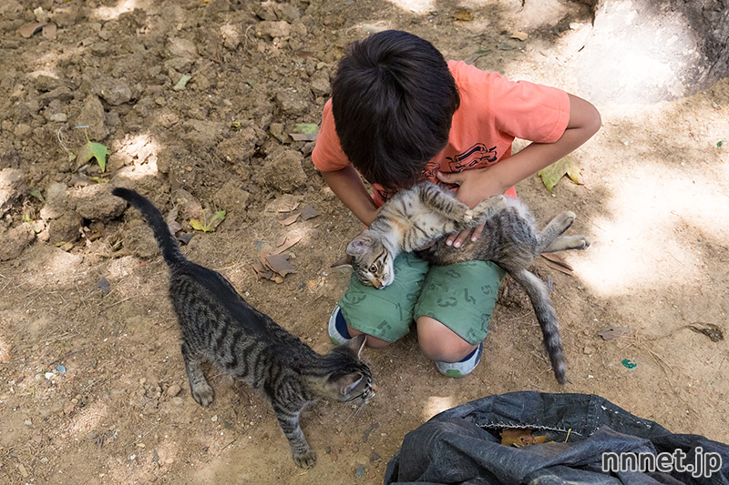 木の枝や葉っぱも使ってキジトラさんと遊びます。動物に優しい子供ってほんと素敵です♪