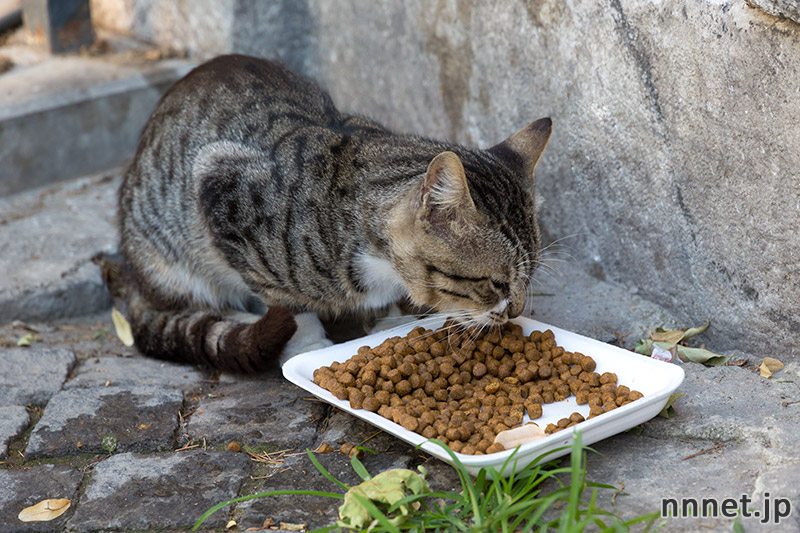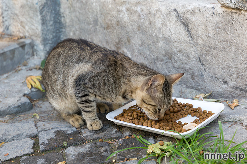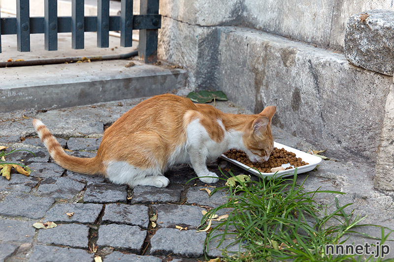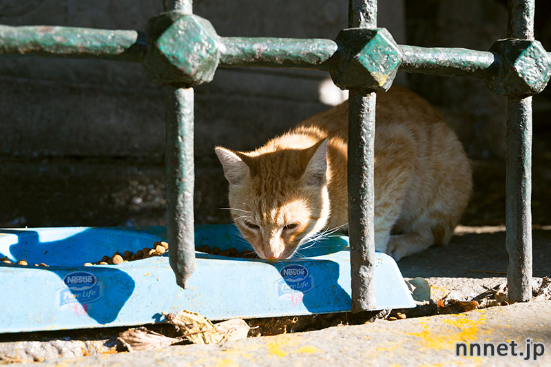 日差しをあびながらのご飯タイム。もぐもぐ美味しそうに食べているチャトラ君です。