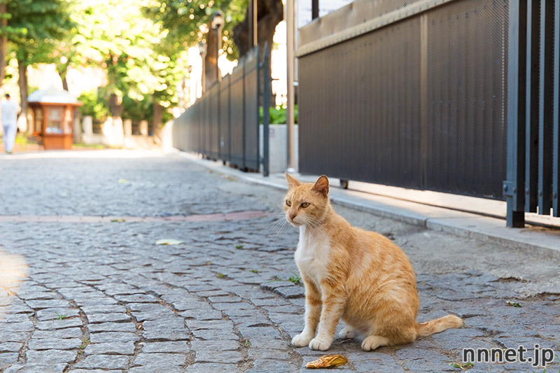 しばらく歩くと、人通りの多い門のそばで、お腹の大きな茶白さんが座っていました。妊娠中なのかな?