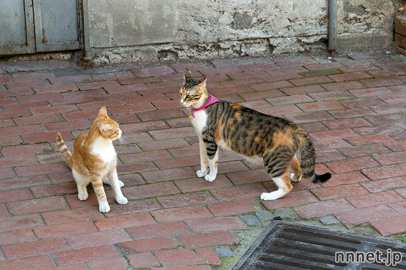 茶トラさんの後ろから突如あらわれた三毛猫さん。そのまま道に飛び出しました。
