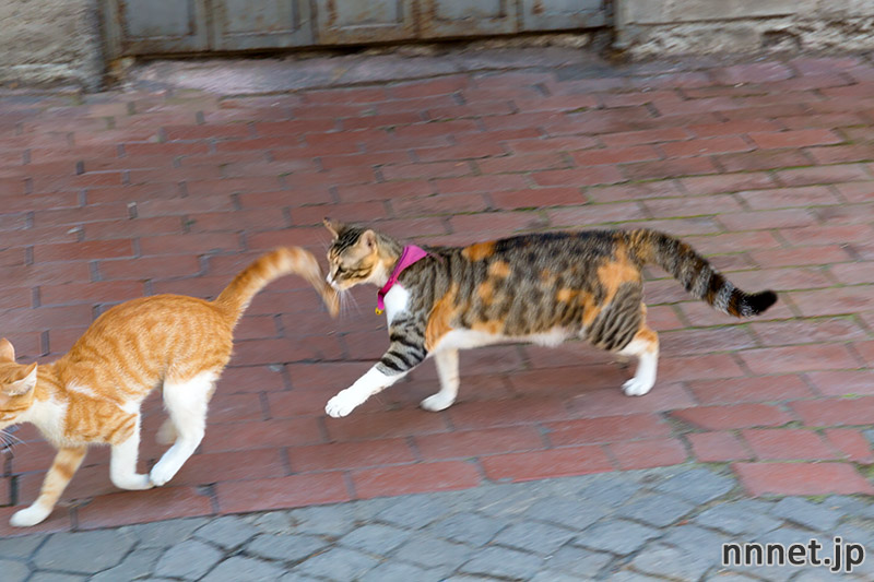 お互い、じっ・・・・と構えたあと、三毛猫さんのダッシュにより、一斉に走り出しました。猫が走り去ると、もう人間には追えません・・・