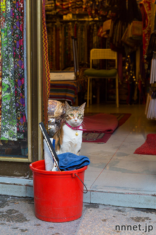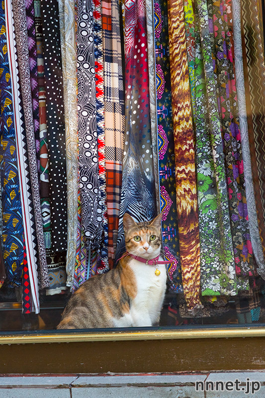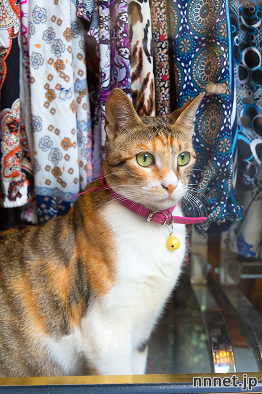 またしばらく時間が開き、この近くを通ると、洋品店の入り口にいる所を発見しました。掃除をしている店主のそばで、静かに座っています。店主は30代くらいの男性。このあたりの猫たちのお世話をしているそうです。その中でも、この三毛猫さんが一番のお気にいりで、首輪をつけて大事にしています。