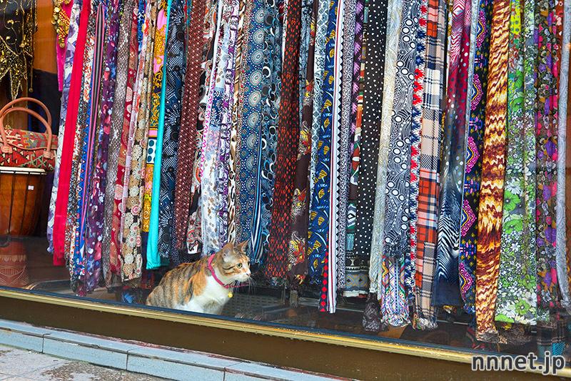 どうやら、別の猫を探している途中だったようです。ササッと走り去るサビ猫さんが見えたかと思うと、Tシャツやさんのディスプレイの後ろに入ってしまいました。