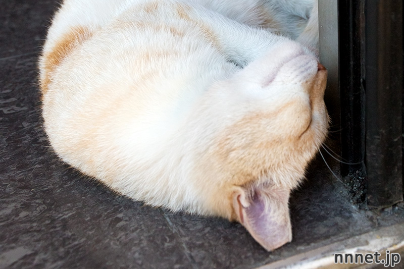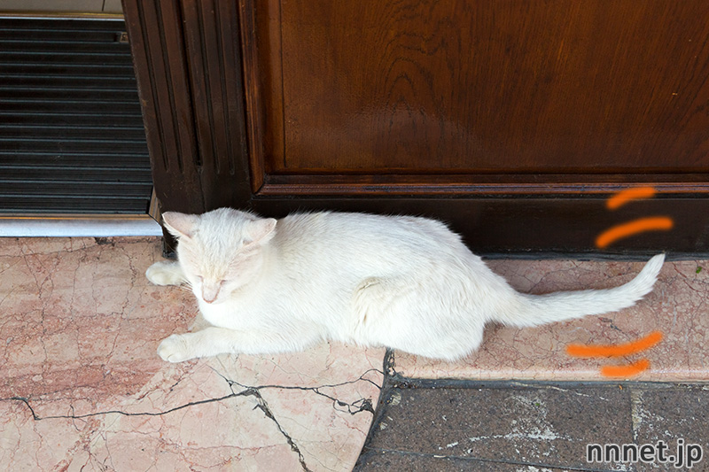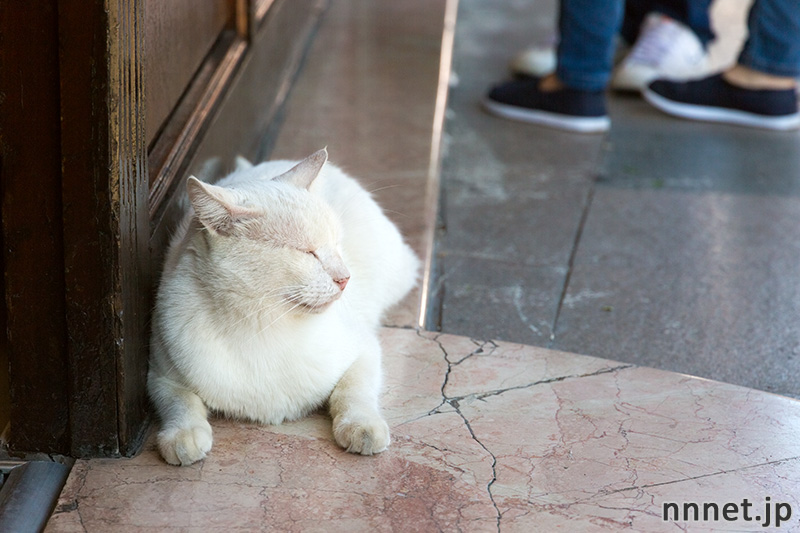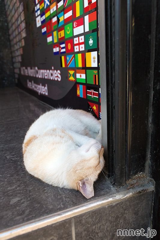 旧市街の大通りを歩いていると、両替所の入り口で眠るクリーム色の猫さんを発見しました。端っこで小さく寝ているので、猫に興味がない方なら気づかずに通り過ぎてしまいます。倒れてるのかな?と心配になり、少し撫でてみましたが、ちょっと体勢を変えただけで大熟睡中です。