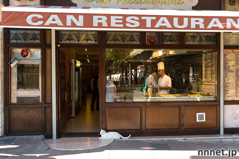 トルコではおなじみ「ロカンタ」と呼ばれる大衆食堂です。ショーウインドウごしに、大量に並べられたお料理を見ることができます。食べたいものを指差してお皿にいれてもらい会計し、奥のテーブルで食べるシステムです。どのロカンタが美味しそうかな?と、通りかかった人たちがショーウィンドウをのぞきます。