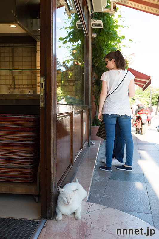 また歩きだすと、すぐ側のレストランの入り口に、別の猫さんがいました。