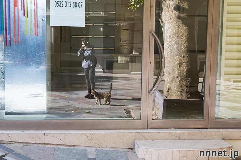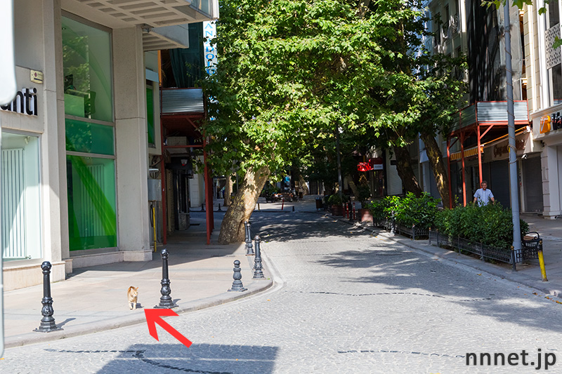 ブランド服店などが並ぶ、おしゃれな通りがあります。お店には黒いスーツを着た店員さんがおり、お店には入りにくい雰囲気です。そんな通りにも、猫さんが歩いていました。