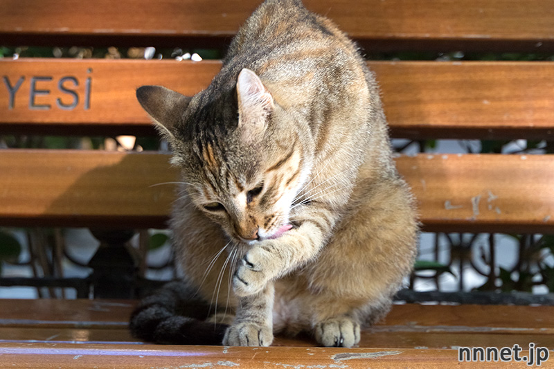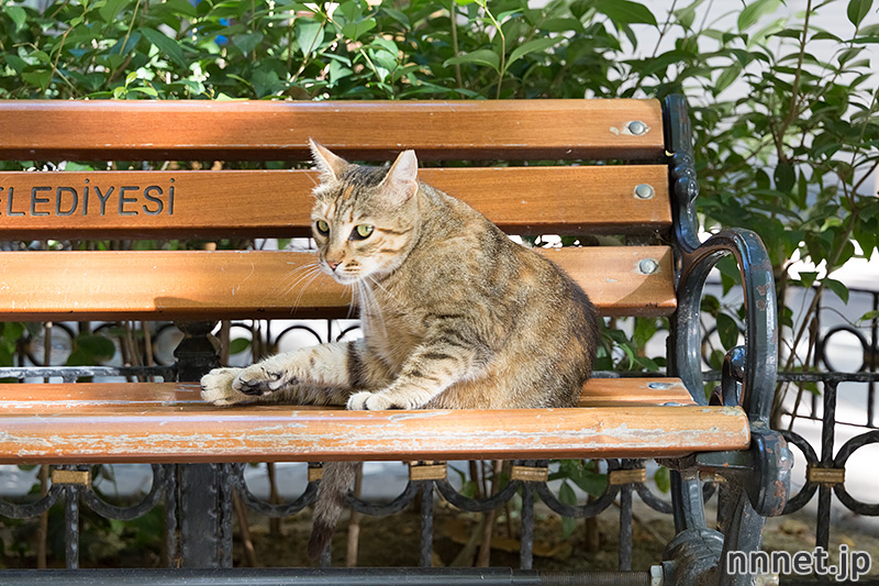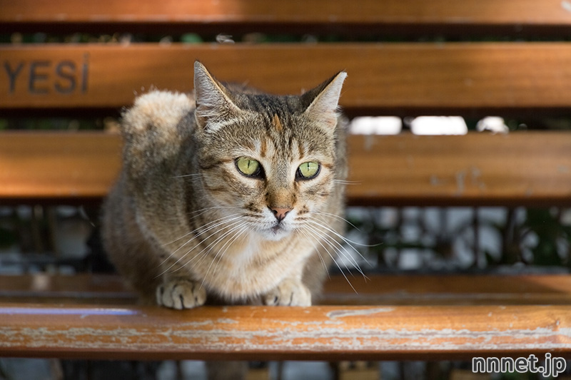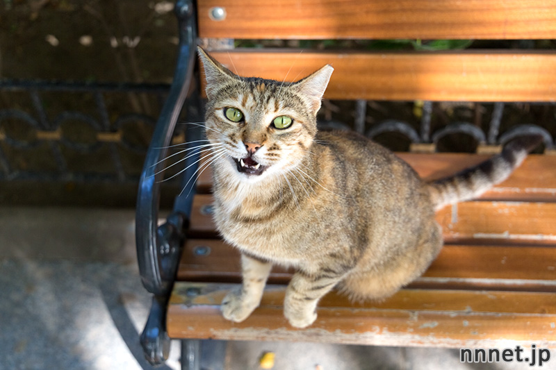 緑色の瞳がかわいいキジトラさん。話しかけてみると、歩いてついてきます。私の足元にすりすりしたまま離れません。このままだと写真が撮れないので、近くにあったベンチをトントンと手で叩いてみました。