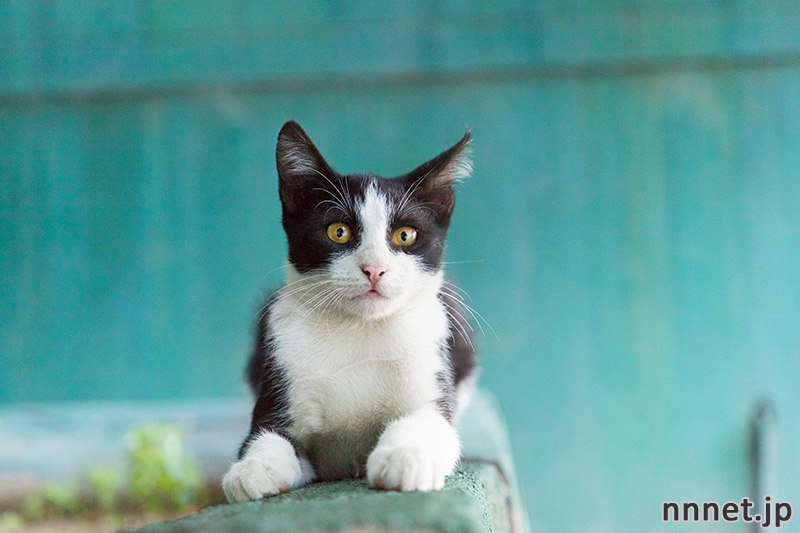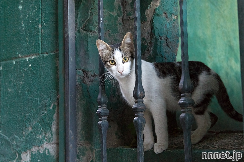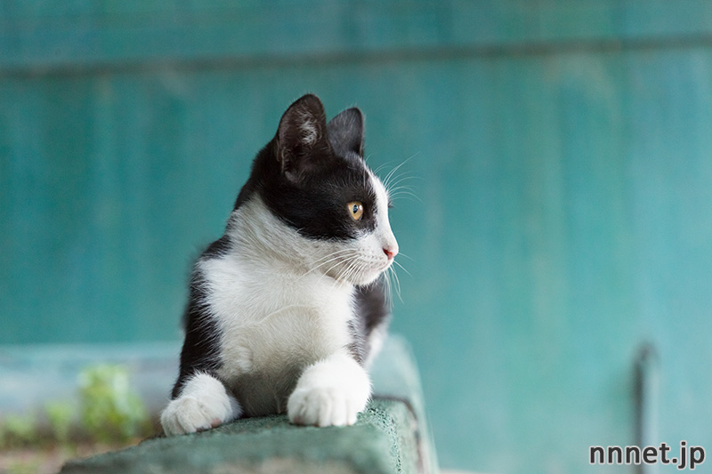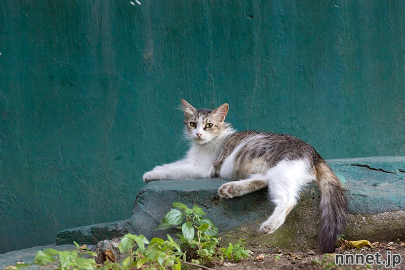 さらに横を見ると、今度は長毛のキジ白さんがくつろいでいました。緑の壁がきれいなこの場所は、大通りから少しはいった路地です。
