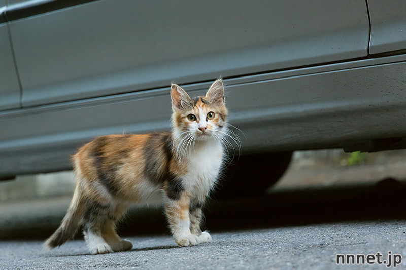足元には茶白さんがやってきて、その後ろからタタタッと小さな三毛猫さんが走ってきます。車の後ろ側は集合住宅になっているようです。