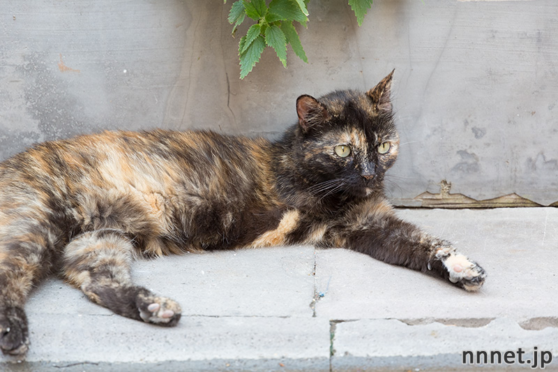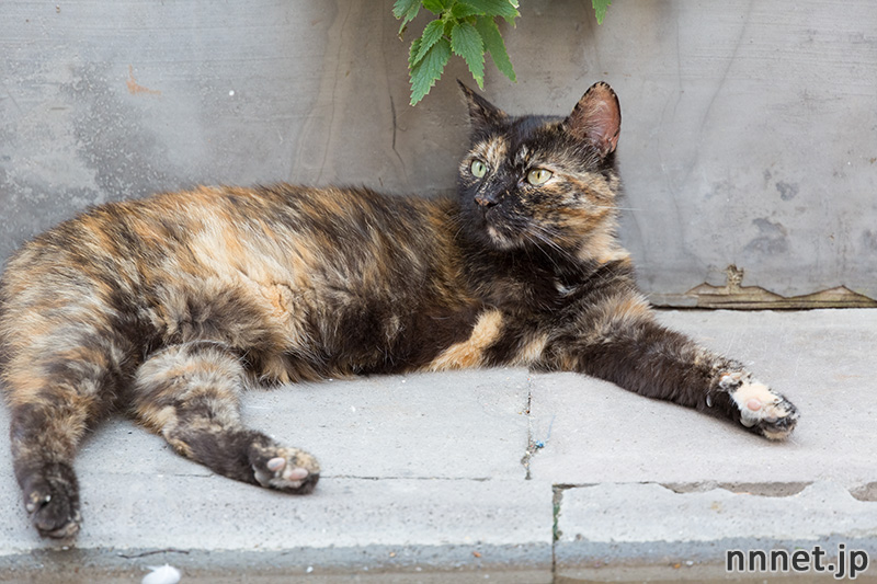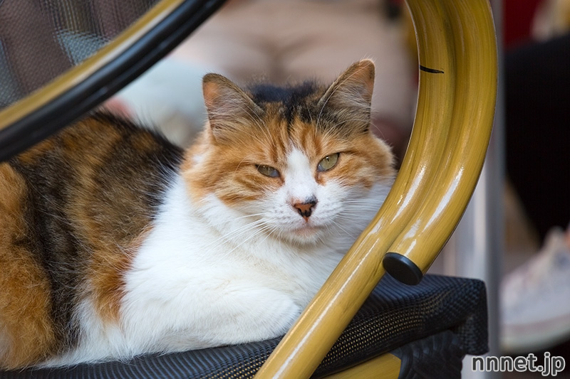 「どうして写真に撮ってるのー?」の表情の三毛猫さん。はじめて見る異国の人に、不審なまなざしです。