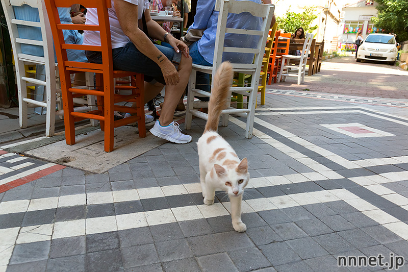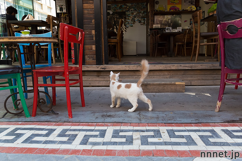 私へのスリスリを済ませると、別のカフェに向かってトコトコ。しっぽを立てて、楽しそうにお散歩です。どうやらカフェの猫ではなく、近所で暮らす猫さんのようです。