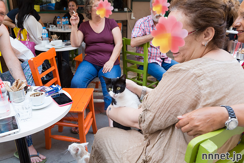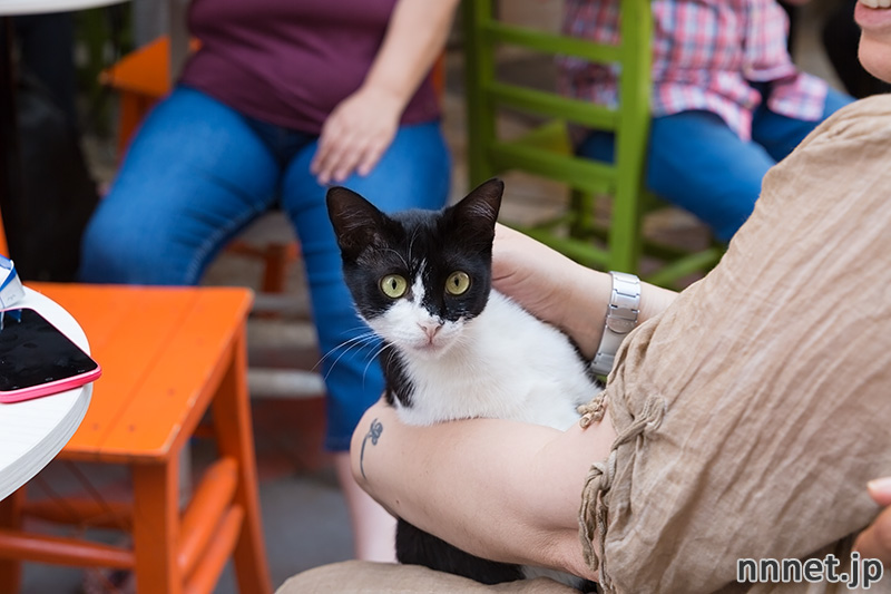 さらに、歩いていると別のカフェのお客さんの膝にも、猫さんが見えました。