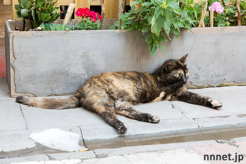 そしてそのテーブルの横の花壇では、サビ猫さんが横たわっていました。