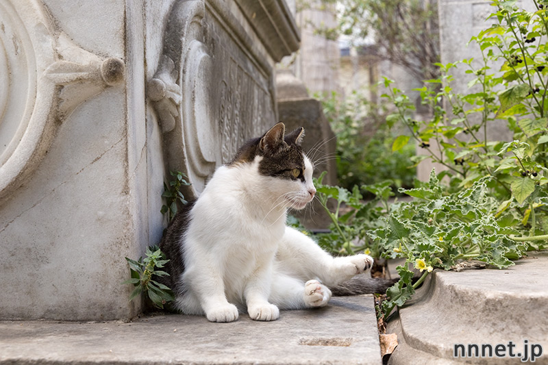 柵の間から墓地をのぞいてみると、毛づくろい中のキジ白さんが!この日はかなり暑い日だったので、墓地の影の涼しい場所でくつろいでいるようでした。