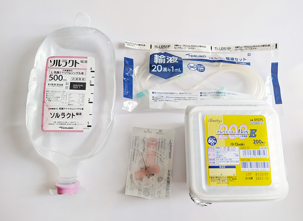 ▲輸液1本に対して、輸液セット(管)1本、針は5本(+失敗したとき用に数本)、エタノールを含んだコットン